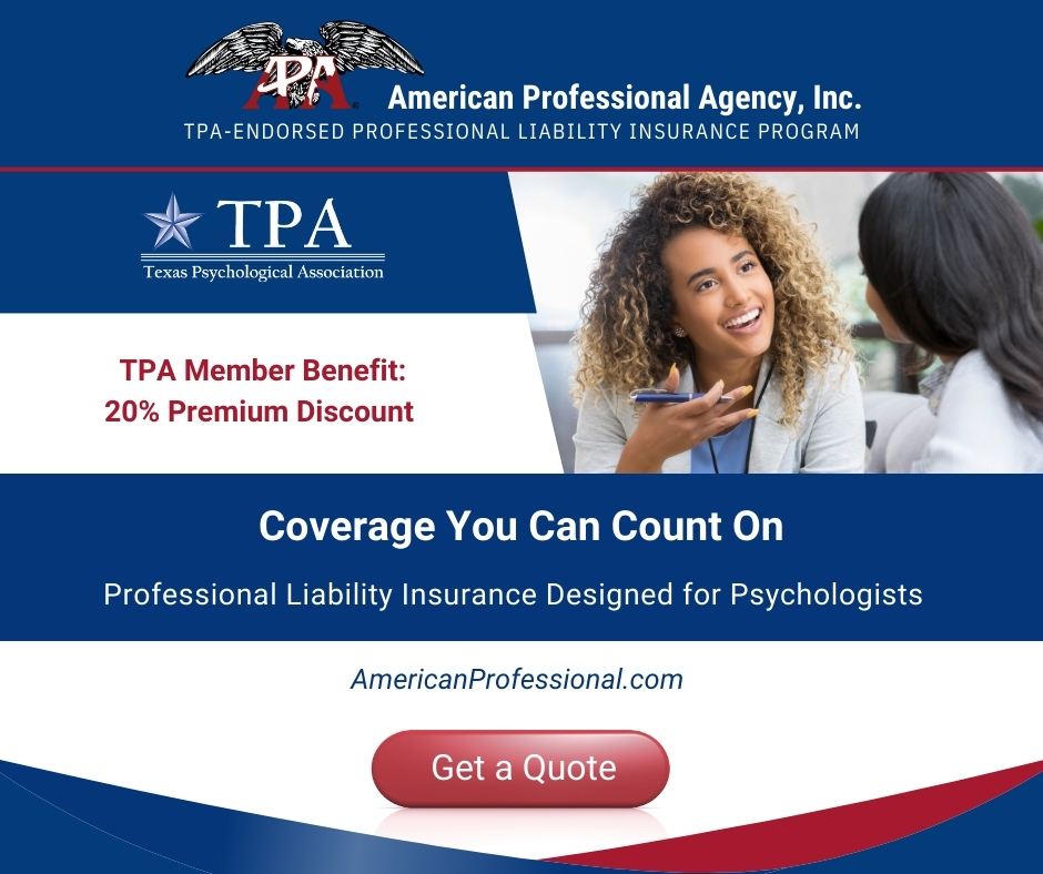 The TPA “Find a Psychologist” tool helps you connect with qualified, licensed psychologists throughout Texas. Whether you're seeking therapy, assessments, or specialized services, our directory allows you to filter by area of expertise, location, and accepted insurance.